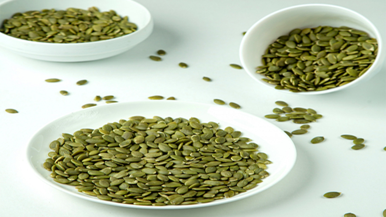 | Appearance | Flat, oval-shaped seeds that are white with the shell or green when hulled. |